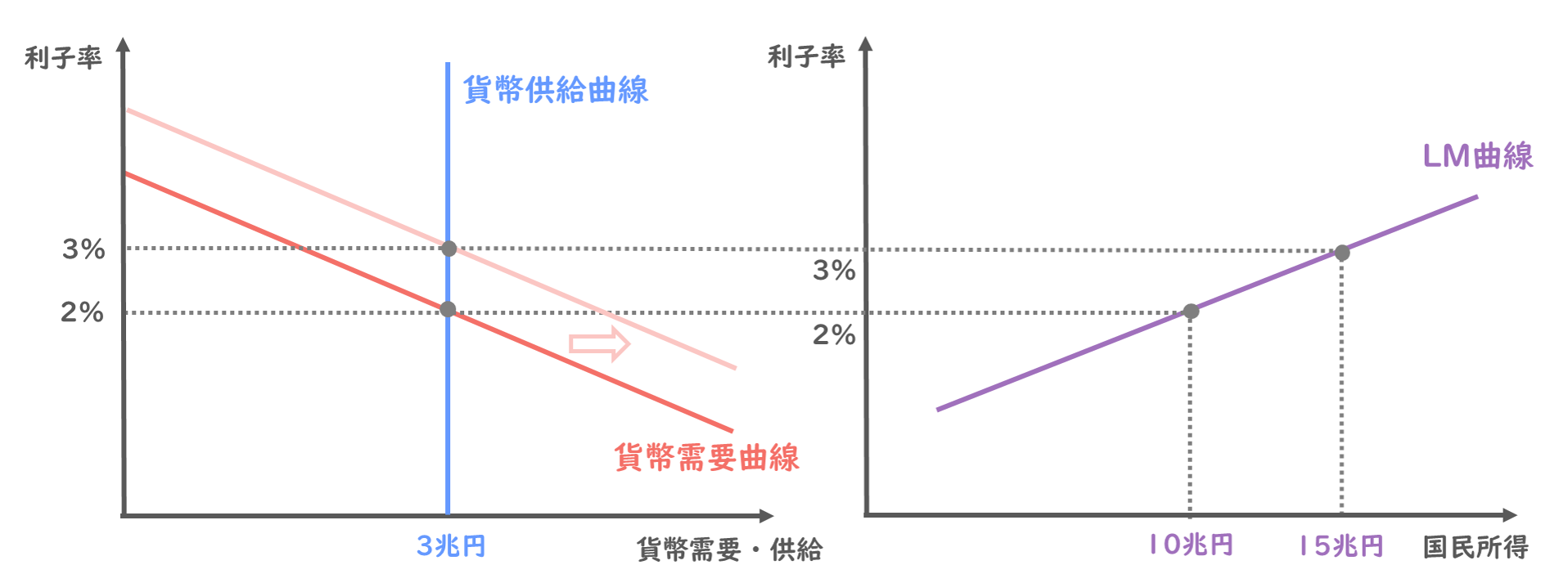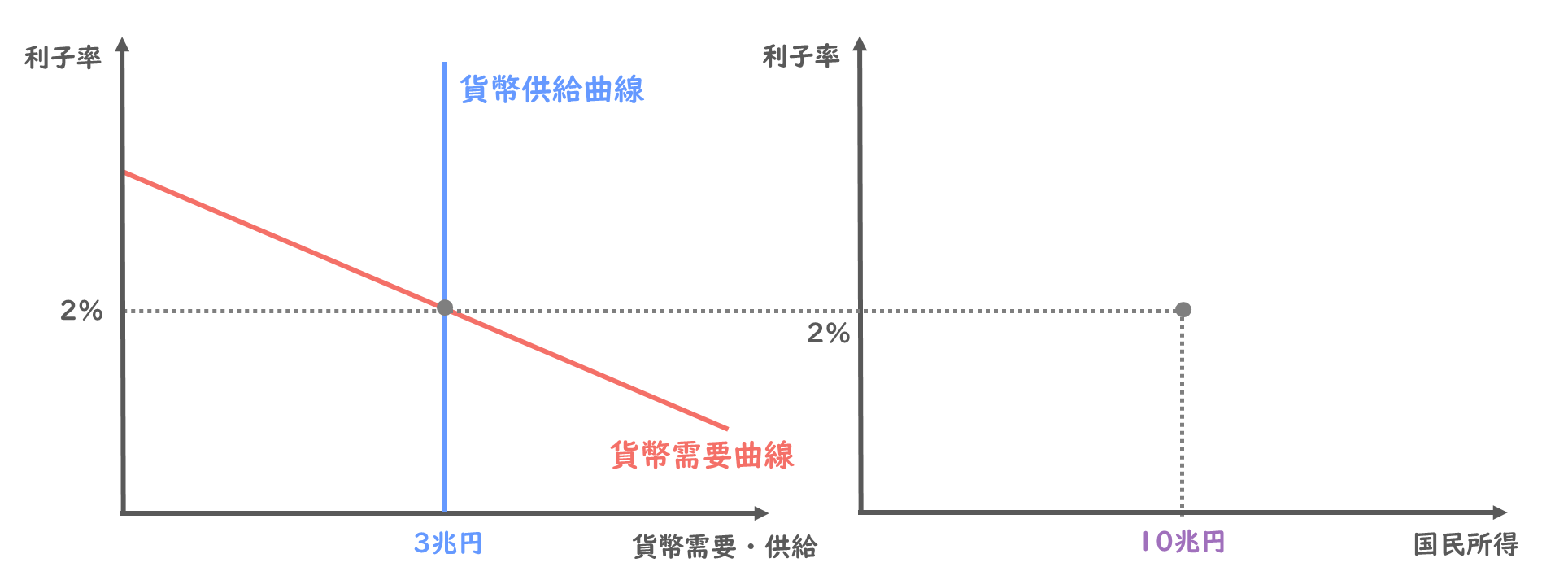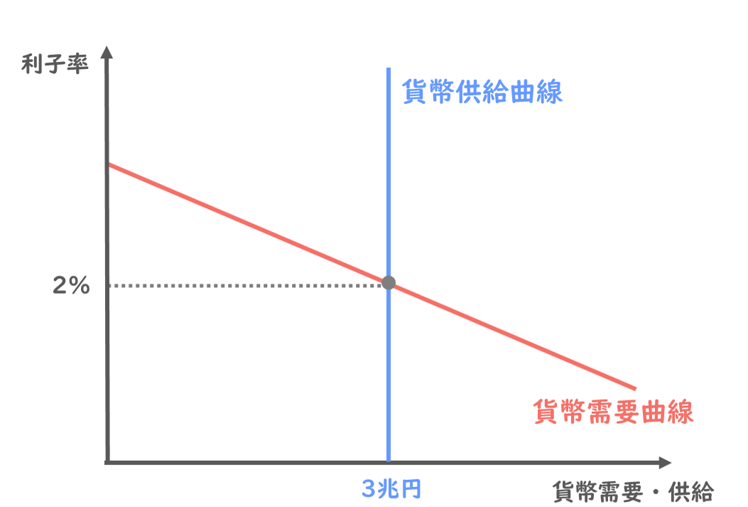 例えば今、利子率2%、貨幣需要・貨幣供給ともに3兆円で均衡していたとしましょう。