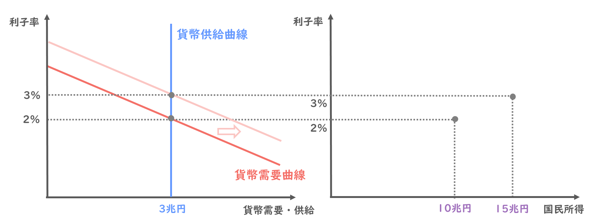 ただし、貨幣市場はあくまで需要と供給が一致する点で決まりますので、もともとの均衡点である3兆円になるように、利子率を引き上げます。